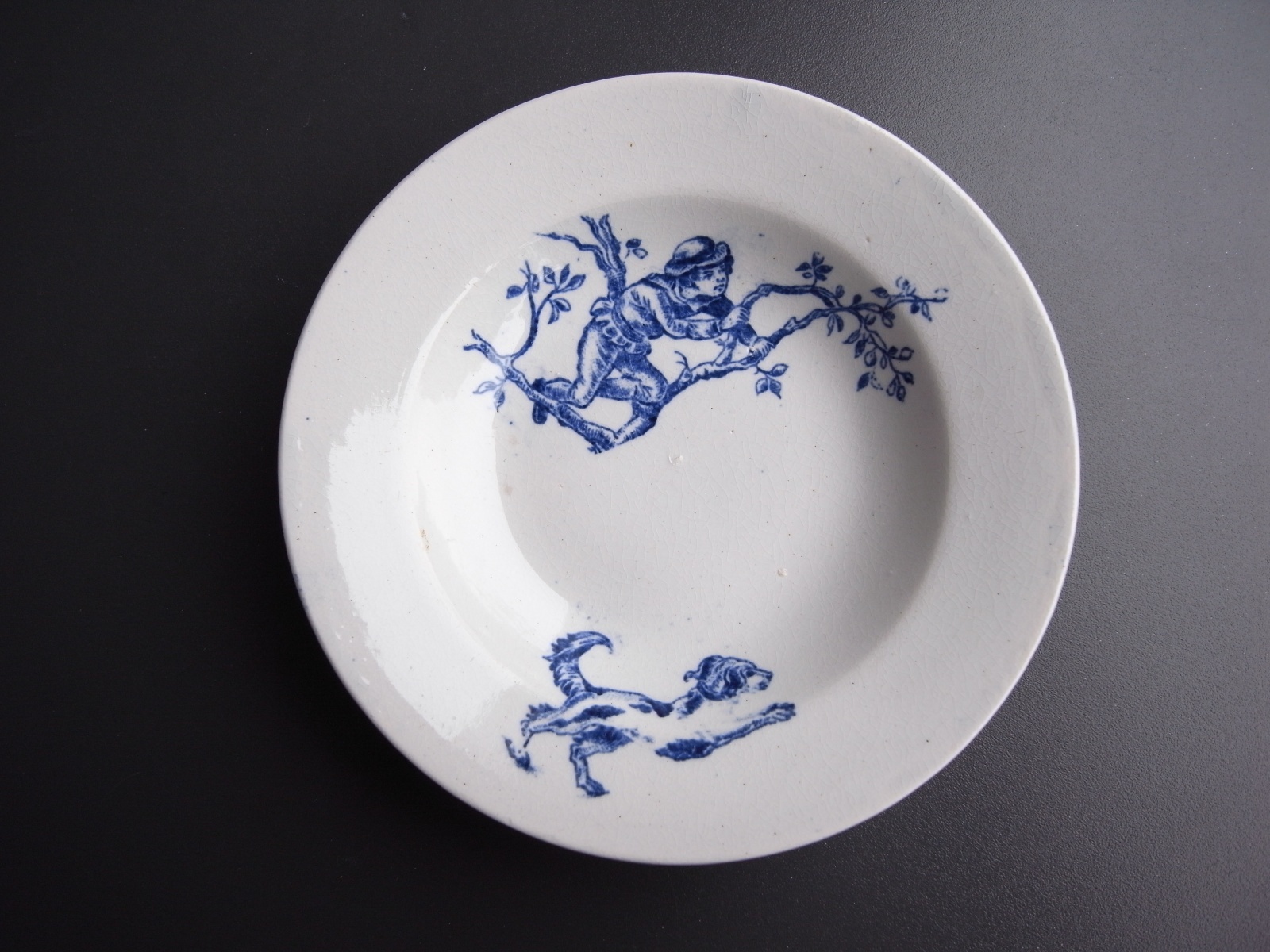 かくれんぼ?狩り? おままごとのお皿 フランスアンティーク かくれんぼ?狩り? おままごとのお皿 フランスアンティーク 販売価格: 3,300円(税込) 在庫数 1点 数量: 1 お問い合わせ 木の上に帽子を被った少年、その下を駆ける犬。 かくれんぼかしら? それとも狩り(けど何も持っていない)?? 白磁にブルーの絵柄が可愛らしい、おままごとのお皿です。 元気に躍動する犬がお気に入り。かわいいです。^^ おままごとにしては少し大きめ、深さもありますので 使い勝手が良さそうです。 カンニュウがありますが、つかかやで美品。 裏側にインク飛びがみられます。 ヒビ、カケございません。 直径 14.7センチ 高さ 2.3センチ 他の写真 中央、右側のお品物です 大きさの比較です 関連商品 Bjørn Wiinbladデザインのお皿 デンマーク 3,300円(税込) 在庫数 1点 キリリとしたピューターの花リム皿 フランスアンティーク 14,000円(税込) 在庫数 1点