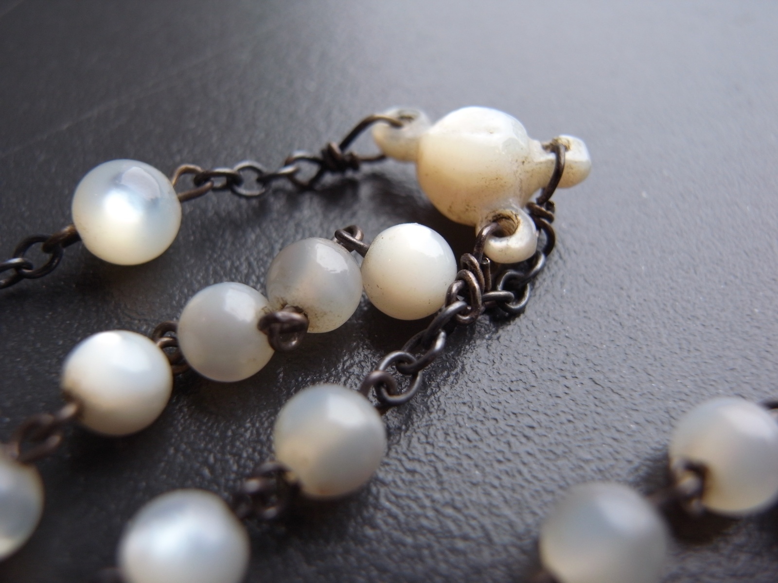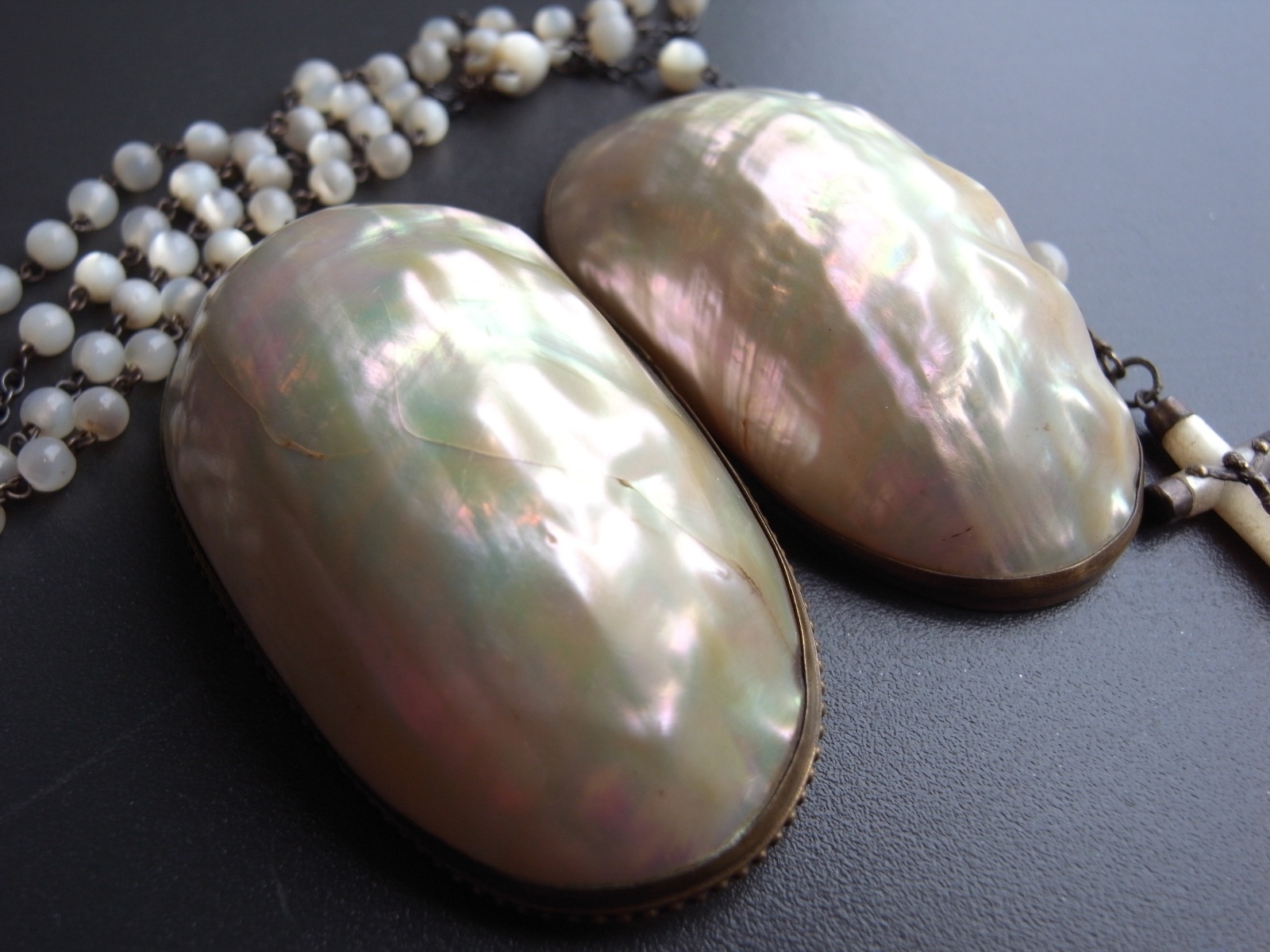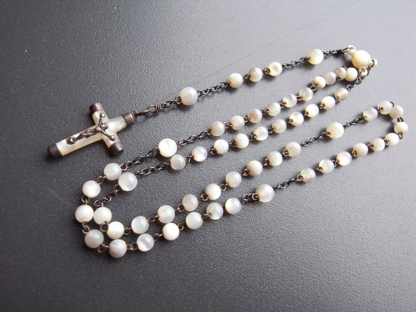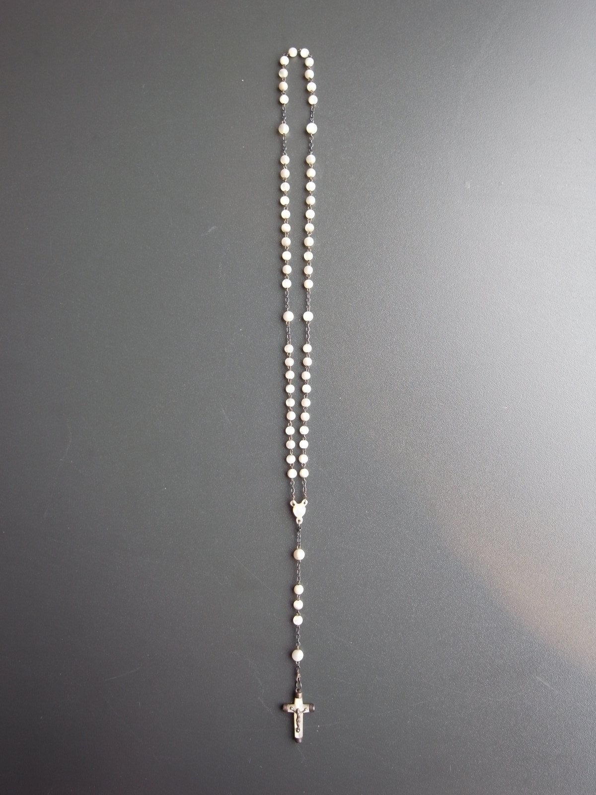 マザーオブパールのロザリオとケース フランスアンティーク マザーオブパールのロザリオとケース フランスアンティーク 販売価格: 3,300円(税込) 在庫数 1点 数量: 1 お問い合わせ 天然素材の白蝶貝を使用した、ロザリオとケースのご紹介です。 ケースには大きな亀裂が入っており、そのためか フタを閉めても隙間があります。 (お値段に反映しております) ロザリオは、首からかけるタイプではなく、 御数珠のように手に持って祈るサイズ感のもの。 ダメージなく、球数も揃っています。 ケース 長辺 約6.8センチ 短辺 約4センチ ロザリオ 長さ 約36センチ 他の写真 天然のものなので、均一ではありません。 ロザリオにダメージはありません。